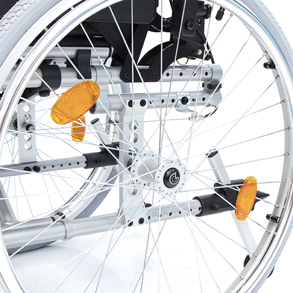 Передние и задние колеса цельнолитые или с пневматическими шинами, в зависимости от назначения коляски. Задние колеса быстросъемные, данная опция позволяет уменьшить габариты кресла при транспортировке. Колеса регулируются по высоте установки.